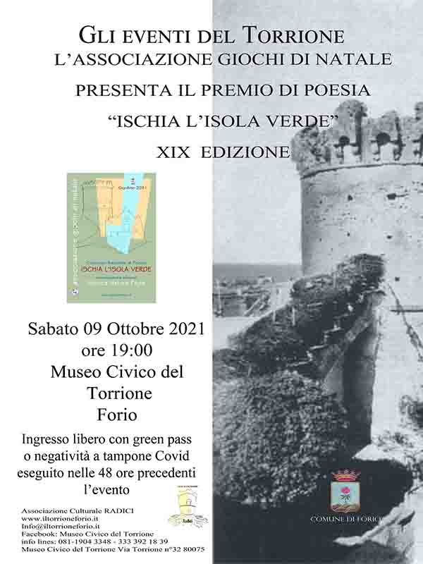 Volge alla fase finale l’ormai consueto appuntamento con la Poesia e, in particolare, con il XIX concorso nazionale di Poesia “Ischia l’isola verde”, indetto dall’Associazione Giochi di Natale, la cui la premiazione è programmata, in sinergia con l’Associazione Radici, per sabato 9 ottobre alle ore 19.00 presso il Museo Civico del Torrione “Giovanni Maltese” In questa sede i vincitori, provenienti da varie regioni d’Italia, e i numerosi poeti e appassionati isolani, declameranno i versi delle copiose composizioni poetiche, pervenute dall’intera penisola italiana.
