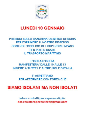 Un intervento di Francesco Del Deo, sindaco di Forio e Presidente dell’ANCIM sulla questione è previsto stamattina durante la trasmissione de la 7 “Agorà” dove potrà confermare quanto scritto nel documento inviato al governo e che ricalca tutto quanto già espresso da numerosi sindaci delle isole minori, per abrogare l’infame ricatto del super green pass.