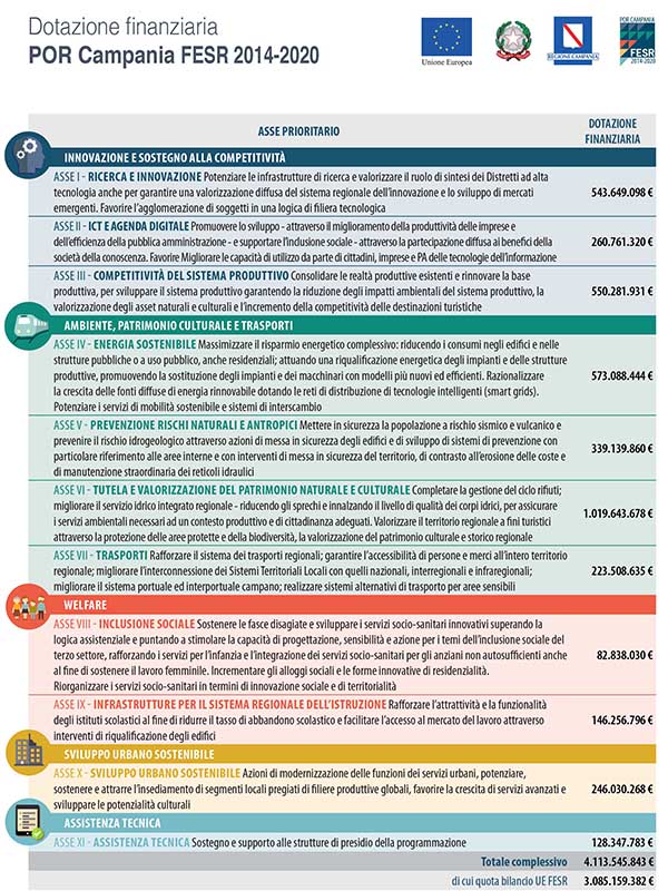 Nella definizione del nuovo Programma, in seguito agli orientamenti dettati dalla Commissione Europea, ci si muove in un quadro complessivo molto «ricco» (dal PNRR ai vari decreti relativi al tema infrastrutture, ad esempio) ma ancora «fluido, labile e dinamico» dato che è ancora in corso la redazione dell’Accordo di Partenariato. Tuttavia dal verbale della Giunta Regionale del novembre 2021, si precisa che “con il prossimo ciclo di programmazione, la Campania potrà beneficiare di circa 4,9 miliardi di euro (in quota UE), di cui 3,8 14 miliardi per il FESR (in quota UE) e circa 1 miliardo di euro per il FSE Plus (in quota UE). Con riferimento alla quota nazionale – sottolinea che anch’essa è ancora in fase di definizione e che verrà determinata anche in considerazione della quota nazionale che sarà attribuita al Programma Complementare 2021/2027”