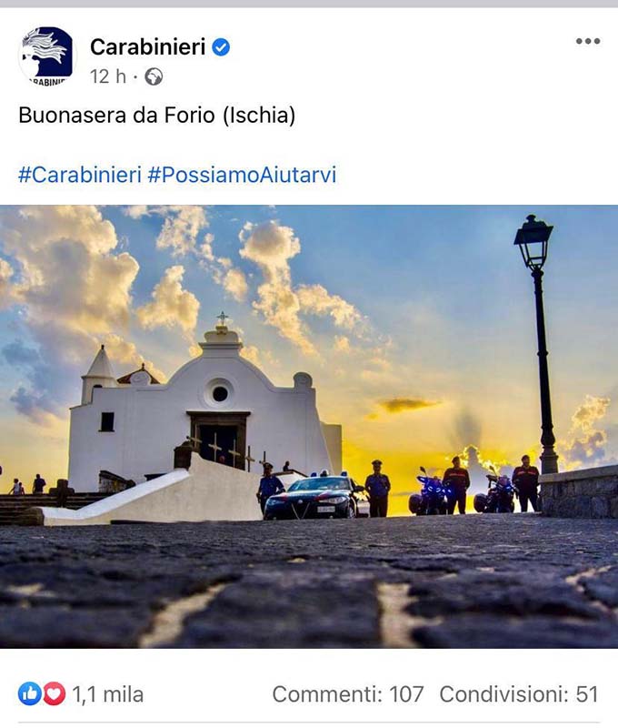 C’è Forio con la Chiesa del Soccorso nello scenario incantevole del tramonto nella pagina ufficiale dell’Arma dei Carabinieri. Il saluto di buonasera con il Nucleo Radiomobile di Ischia rappresentato con l’Alfa Romeo Giulia giunta sull’isola da pochi giorni. I militari sullo sfondo con le moto del reparto della Compagnia di Ischia retta dal Capitano Angelo Pio Mitrione.