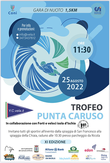 La manifestazione sportiva patrocinata dal comune di Forio presente ininterrottamente da 11 anni come appuntamento sportivo dell’estate isolana. lo storico Yacht Club Vela.it ed i Forti e Veloci isola d’Ischia, come ogni anno , si sono attivati per organizzare la ormai “tradizionale” gara “Trofeo Punta Caruso”.