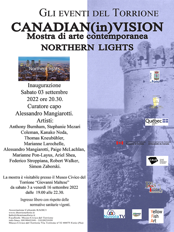 L’evento organizzato in collaborazione con l’associazione Radici e con il patrocinio dell’  Ambasciata del Canada a Roma, della Delegazione del Quebec a Roma e della Galleria Yellow Fish Art di Montreal, si svolgerà dal 3 al 16 settembre 2022 al Museo Civico “Giovanni Maltese” presso il Torrione Forio, dove sabato 3 settembre alle ore 20.30 ci sarà una conferenza stampa introduttiva e, a seguire, l’inaugurazione.