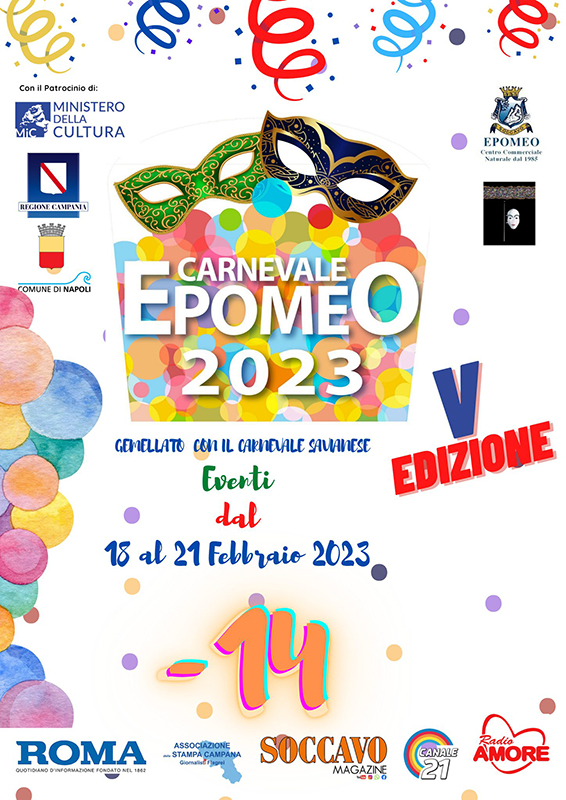 Ritorna il Carnevale Epomeo, il grande appuntamento organizzato dal Centro Commerciale Naturale Epomeo presieduto da Giovanni Adelfi e che è giunto alla sua quinta edizione. Un evento ricco di iniziative, spettacoli ed ottimo cibo. Un evento patrocinato dal Ministero della Cultura, dalla Regione Campania e dal Comune di Napoli. In collaborazione con il giornale Roma, Canale 21 e Radio Amore. L’occasione giusta per vivere giorni divertenti in una zona importante della periferia napoletana.