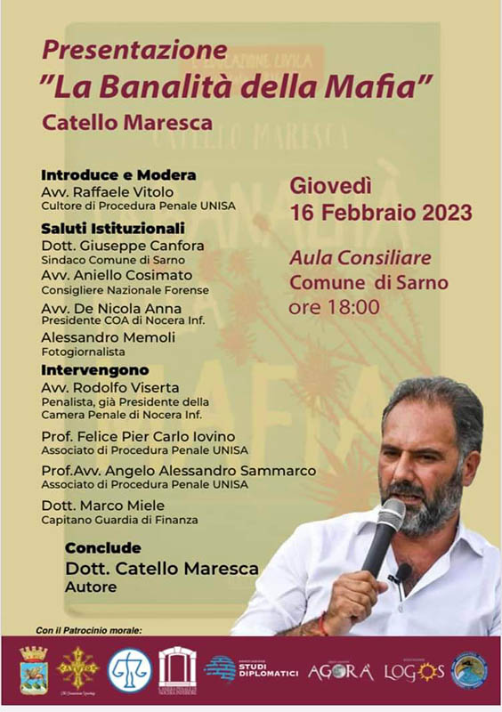 Dopo i saluti istituzionali del sindaco del Comune di Sarno Giuseppe Canfora, del consigliere nazionale forense, avv. Aniello Cosimato, dell’avvocato Anna De Nicola, presidente del Consiglio dell’Ordine degli Avvocati di Nocera Inferiore, e del fotogiornalista Alessandro Memoli, interverranno l’avvocato Rodolfo Viserta, penalista, già Presidente della Camera Penale di Nocera Inferiore, i professori Felice Pier Carlo Iovino e Angelo Alessandro Sammarco, associati di Procedura Penale presso l’Università di Salerno, il dottor Marco Miele, Capitano della Guardia di Finanza. Concluderà l’evento l’intervento dell’autore del libro, il magistrato Catello Maresca.“Ho organizzato la presentazione del libro del dottore Catello Maresca perché penso sia necessario sensibilizzare la cittadinanza, ed in particolare i più giovani, rispetto ad un fenomeno organizzato in evoluzione e camaleontico – commenta l’avvocato Vitolo, organizzatore dell’atteso evento – È opportuno quotidianamente concertare, condividere e stimolare il dialogo istituzionale tra avvocatura, autorità giudiziaria e le compagini sociali come università e scuola”. La partecipazione all’evento consente di conseguire tre crediti formativi agli avvocati del Foro di Nocera Inferiore.