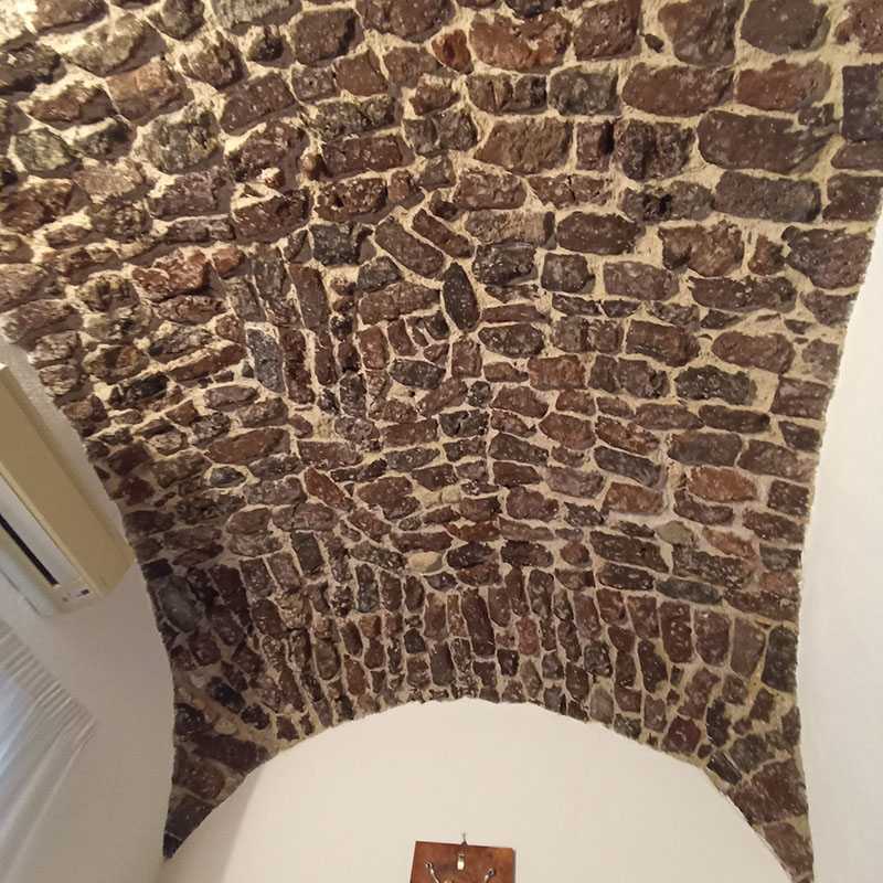 La porta nella piazza del Casale simile prospettiva tiene il convento dalla ditta chiesa vi è una porta che entra in un camerone, e qui lo serve per chiostro e dormitorio, dove vi sono due camere, e dall’altro di una stanza, serve per cucina e dispensa punto dalla parte di detto camerone si fa uscita ad un poco di cortiglio contiguo con giardino di misure tutto murato in circuito e detto giardino serve per li Padri. Avertendo che detto camerone, e camere, sono terrane, e dal cortiglio si va sulla porta del convento sopraddetto. Il bilancio annuale del convento si aggirava intorno ai 125 scudi, di cui ben 96 incidevano per il vitto, vestiario e o conventi vennero aboliti definitivamente entro il 1653. Altra fonte: “Barano d’Ischia, Storia” di G.G.Cervera, e Agostino Di Lustro, pagg. 99 e seguenti. Nelle foto, la volta a botte venuta in superficie dopo aver grattato l’intonaco. L’orto era ed è di fronte.