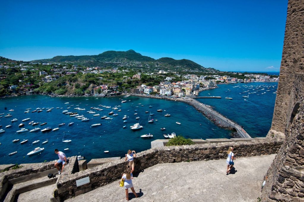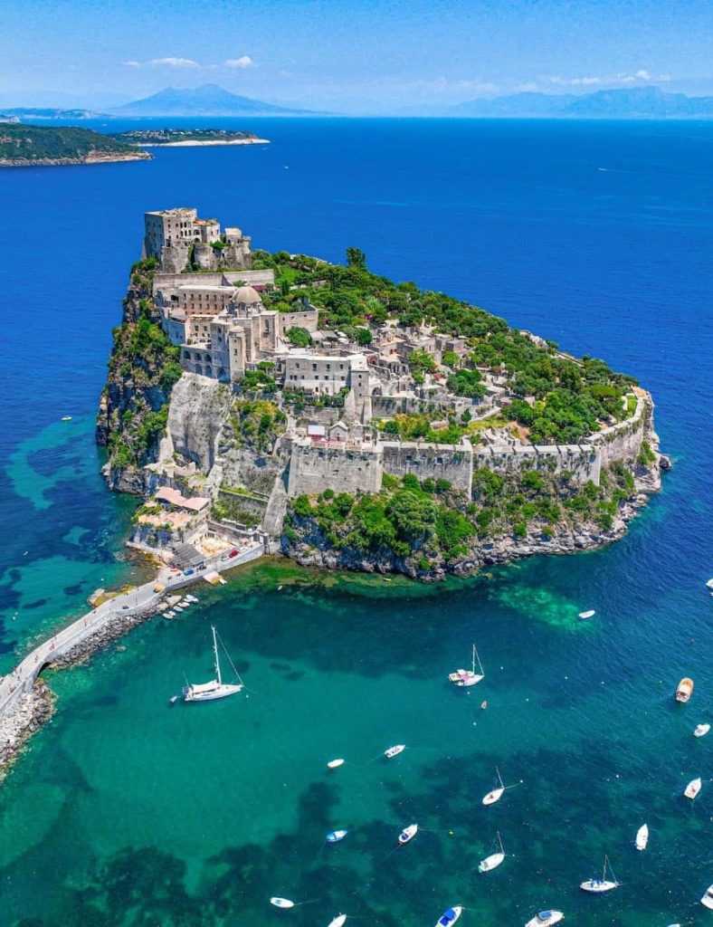 Questa Isola è discosta da Napoli diciotto miglia, e quattro dalla terraferma, ed è più ricca di quella che si conviene alla sua piccolezza. Quelli che vi abitano, si esercitano nelle pescagioni, e nell’arte del marineccio. In fronte a questa isola, quanto un tratto di mano, vedesi un monte di circa un miglio di altezza, e quasi di altrettanto spazio di giro, congiunto con un piccol ponte della medesima isola, tutto tagliato d’intorno e battuto dal mare, con un sentiero molto stretto.