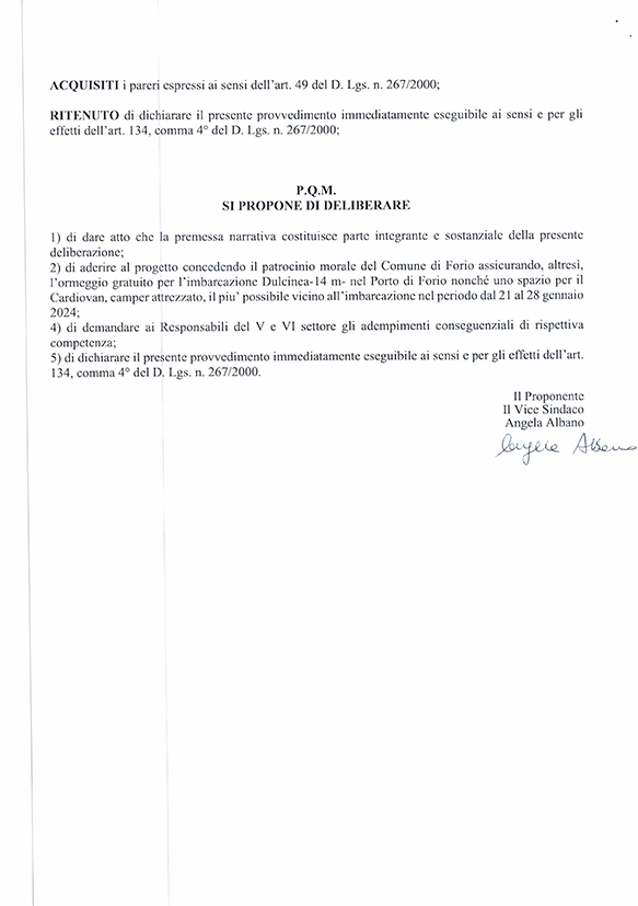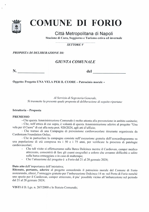 (cs) – Il Presidente del Consiglio Comunale di Forio Giovanni Mattera fa luce sulla vicenda del progetto “Una vela per il cuore”. “In seguito alla diffusione di notizie non veritiere in merito al progetto “Una vela per il cuore”, intendo fare luce sulla vicenda”, ha dichiarato Mattera. “Il progetto, fondato su una campagna di screening gratuiti per la prevenzione di malattie cardiovascolari, è stato proposto dal capitano dell’imbarcazione Dulcinea, che ha già operato in 48 città italiane. La proposta è stata inoltrata a me, in quanto Presidente del Consiglio Comunale, e ha ricevuto il mio pieno sostegno. Con l’impegno del sottoscritto, unitamente al delegato alla Sanità, il vicesindaco Angela Albano, al consigliere Prof. Aniello Di Maio, si è provveduto ad ufficializzare l’iniziativa con la Delibera di Giunta Comunale n.4 dell’11.01.2024 (presente in allegato). In questi giorni, un consigliere di minoranza ha erroneamente attribuito a sé il merito dell’iniziativa, confondendola con l’iniziativa Flegrea 2024. Tali dichiarazioni sono completamente false e mi sento in dovere di smentirle pubblicamente. Ringrazio, inoltre, per la disponibilità e la celerità con cui si è organizzato il tutto, l’assessore delegato al Porto Nicola Monti e il Consigliere delegato al Demanio Alessandro Morgera. L’iniziativa “Una vela per il cuore” si è svolta a Forio dal 21 al 28 gennaio 2024.”