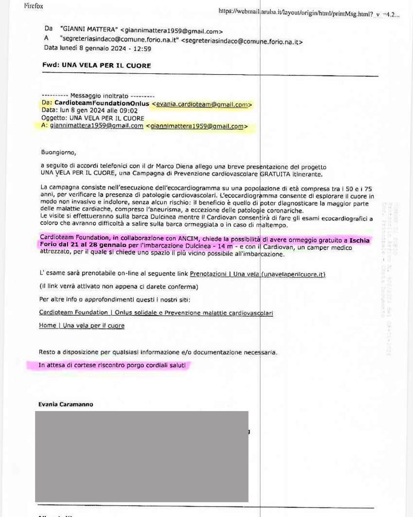 Di seguito sono riportati testualmente i messaggi conclusivi con cui si è definita l’iniziativa: “Assessore Se mi manda una mail ci accordiamo per Forio! Cardioteam Foundation” “Buongiorno dottore, si si, ti invio mia e-mail, giannimattera1959@gmail.com resto in attesa di notizie, sono completamente a tua disposizione” “Molto bene.