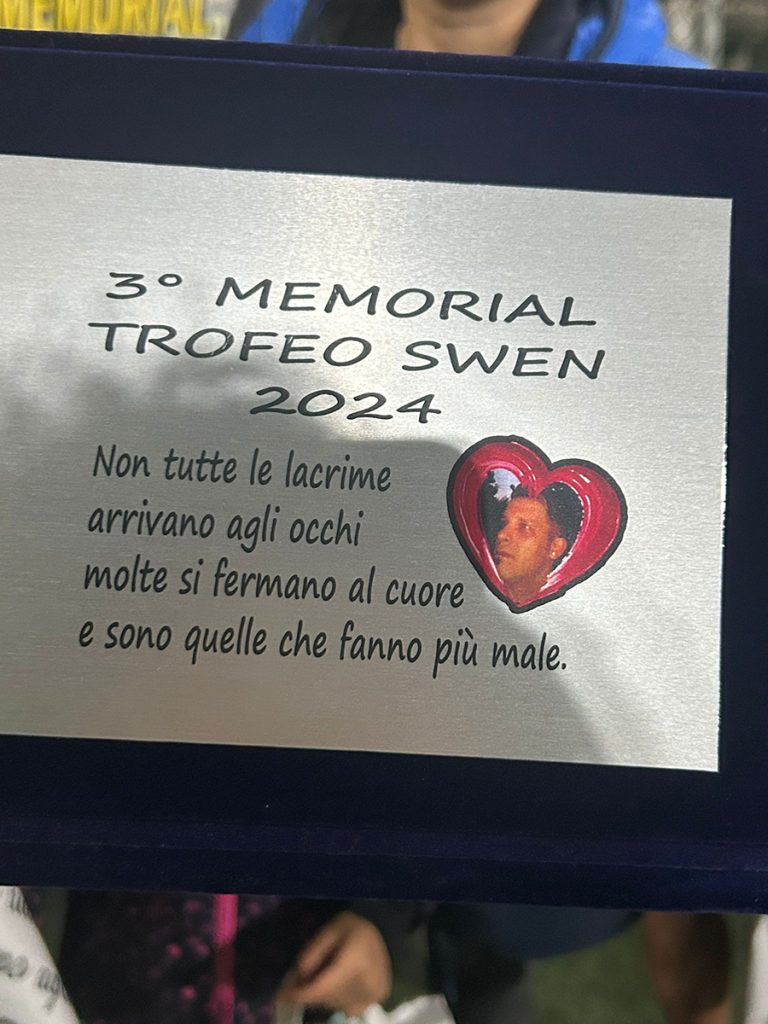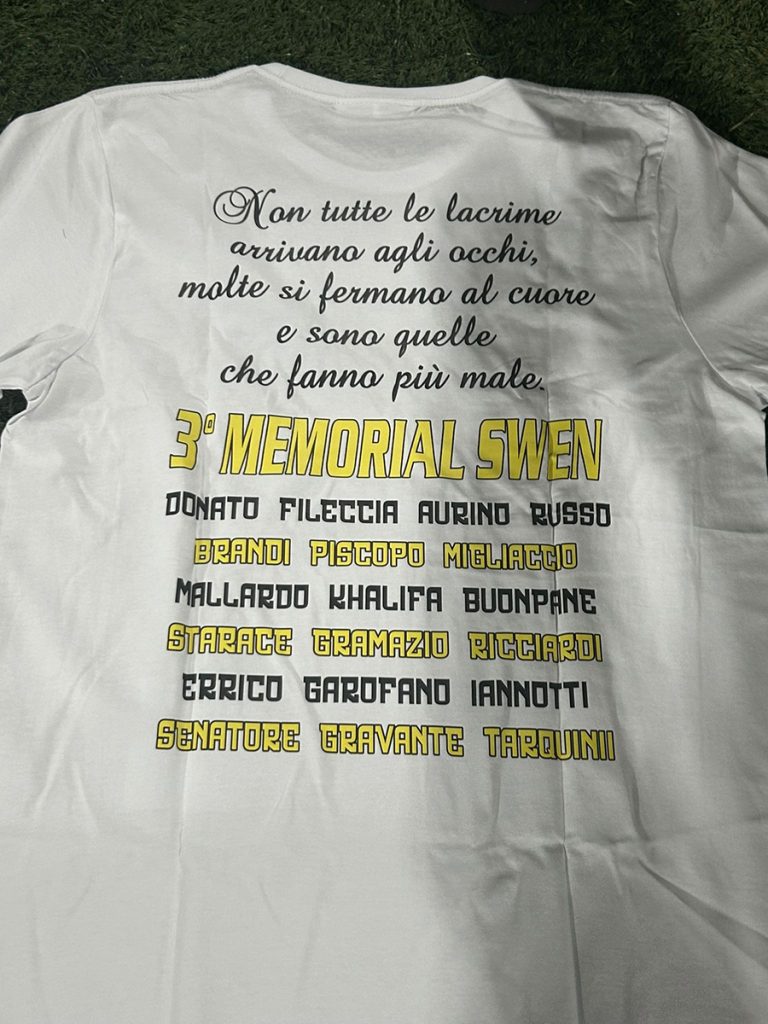 Ogni squadra è caratterizzata da un colore, blu, bianco e giallo, come la squadra del cuore di Swen: il Borussia Dortmund. Il memorial viene vinto dalla squadra gialla composta da Salvatore Senatore, Cosimo Grammazio, Loris Iannotti, Checco Errico, Gianni Garofano, Donato Penna.  La fine della partita comincia una celebrazione con premi, concedendo prima la dovuta attenzione alla famiglia di Swen. Con una targa dedicata a loro, una maglietta con gli sponsor (cartotecnica, davidwirldwide, Snai, pasticceria bar Lucia, zampe felici, supermercato tabacchi Letizia, Arca di Noè del prete Modestino) i nomi dei ragazzi e vari doni per le bambine.