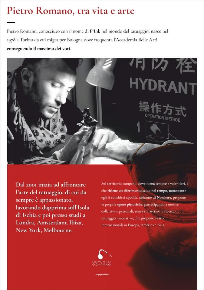 Pietro Romano (Torino, 1978 – Brescia 2019) conosciuto con il nome di P’ink nel mondo del tatuaggio si trasferisce a Bologna dove frequenta l’Accademia di Belle Arti conseguendo il massimo dei voti. Dal 2001 apprende l’arte del tatuaggio da cui resta affascinato, lavorando dapprima sull’isola d’Ischia e in seguito presso studi a Londra, Amsterdam, Ibiza, New York e Melbourne. Torna sul territorio campano che ritiene “un riferimento saldo nel tempo” proponendo le sue opere pittoriche, partecipando a mostre collettive e personali senza tralasciare la ricerca di un tatuaggio innovativo che propone in studi internazionali in Europa, America e Asia.