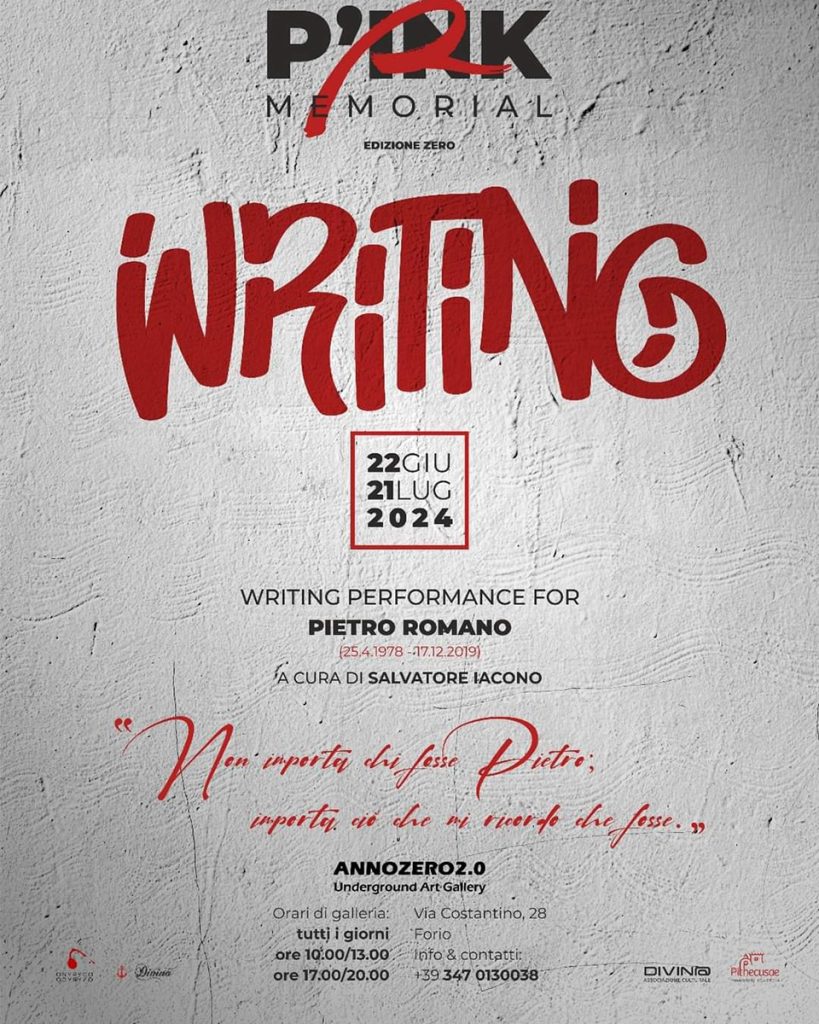 FORIO – «Non importa chi fosse Pietro; importa ciò che mi ricordo che fosse».Sarà nuovamente la memoria e il ricordo, il Leitmotiv nella writing performance dedicata a Pietro Romano, in arte “P’ink”. Il vernissage – ingresso gratuito – andrà in scena il 22 giugno alle ore 21 presso la Galleria underground ANNOZERO 2.0 fondata dal performer e gallerista Salvatore Iacono in via Costantino 28, a Forio, sull’isola d’Ischia, nei caratteristici vicoli saraceni. La mostra, organizzata con l’ausilio dell’associazione DIVINA e della Pro Loco Pithecusae di Forio, sarà visitabile fino al 21 luglio tutti i giorni dalle 10 alle 13 e dalle 17 alle 20.
