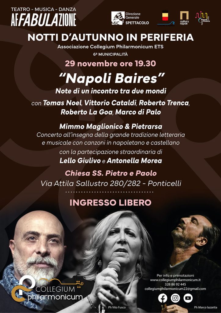 Venerdì 29 novembre alle 19.30 presso la Chiesa dei Ss. Pietro e Paolo (via Attila Sallustro 280/282 a Ponticelli) in scena lo spettacolo «Napoli Baires – Note di un incontro tra due mondi»,ideato e diretto da Mimmo Maglionico.