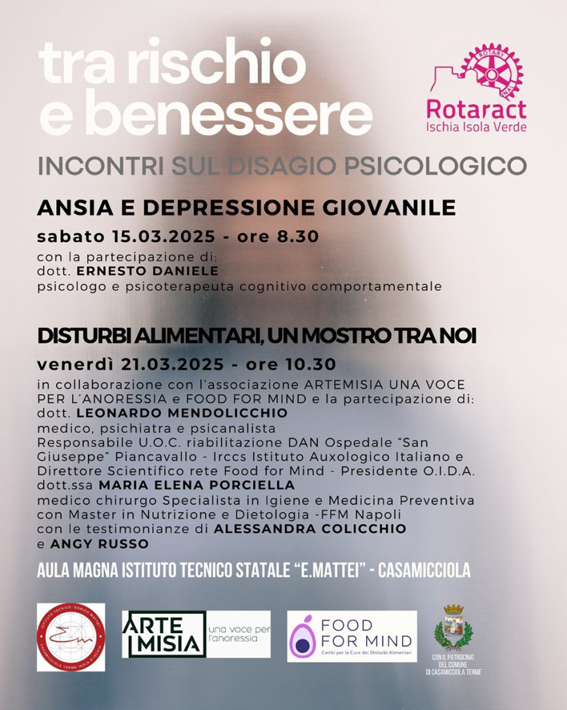 Sarà l’approfondimento e l’analisi delle possibili soluzioni ai disagi psicologici ed i disturbi alimentari del mondo giovanile il focus di due appuntamenti organizzati dal Rotaract Club Isola Verde ed in calendario per sabato 15 e venerdì 21 marzo prossimi, presso l’aula magna dell’istituto Mattei a Casamicciola.