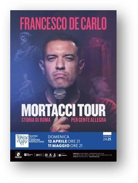 Dopo aver registrato, con largo anticipo, il “tutto esaurito” ad aprile, Francesco De Carlo ritorna domenica 11 maggio con la replica del suo show irriverente “Mortacci tour. Storia di Roma per gente allegra”.