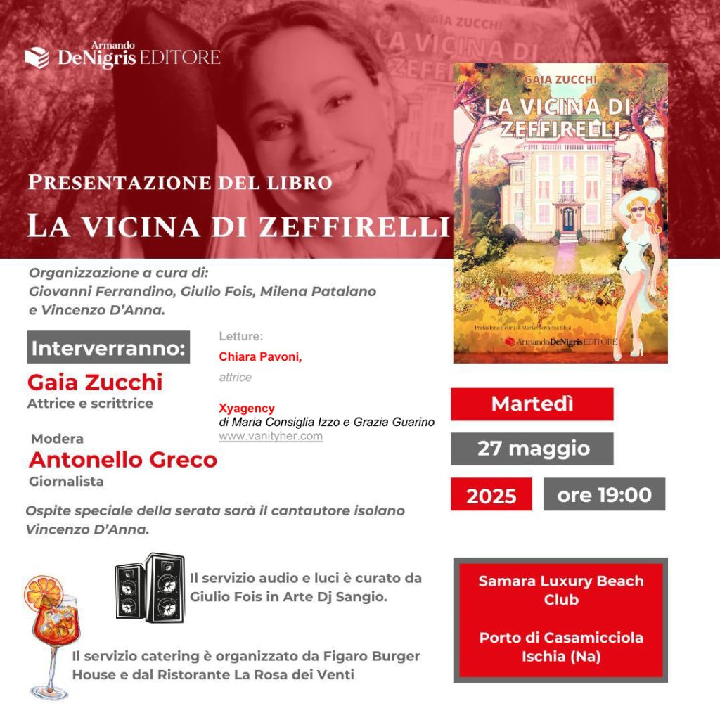 Dopo una lunga tournée e un successo straordinario, “La vicina di Zeffirelli” fa tappa sulla magica isola di Ischia. Il best seller dell’attrice Gaia Zucchi, pubblicato in occasione del centenario della nascita del grande regista e edito da De Nigris Editori, è da subito balzato in testa alle classifiche di vendita, diventando un vero e proprio caso editoriale indipendente unico. Con oltre 10.000 copie vendute e la terza ristampa già in corso, il volume ha conquistato il pubblico di tutta Italia. L’isola di Ischia, con la sua lunga storia di set cinematografici e buen retiro per artisti di fama internazionale, rappresenta un palcoscenico ideale per celebrare la memoria di un Maestro che ha saputo elevare il cinema italiano a vette inesplorate.