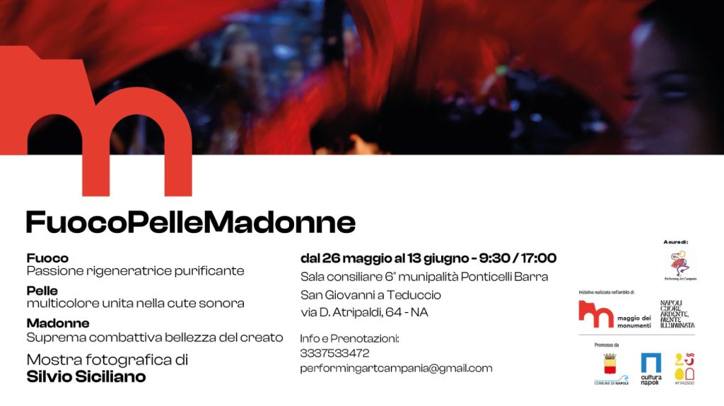 Da lunedì 26 maggio a venerdì 13 giugno, nella Sala consiliare VI Municipalità (Via Atripaldi, 64) sarà visitabile gratuitamente tutti i giorni, dalle ore 9,30 alle 17.00, la mostra fotografica “Fuoco Pelle Madonne” di Silvio Siciliano che porta in mostra un corpus di immagini con cui racconta la bellezza, la forza e la sacralità dei riti femminili del Sud Italia. Un’esposizione che mette al centro la “pelle” come elemento di vibrazione tra tamburi, corpi, devozione e identità.