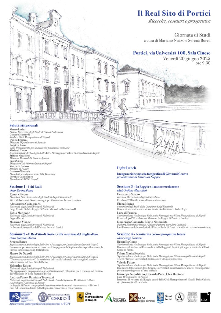 Venerdì 20 giugno 2025, a partire dalle ore 9.30, la Sala Cinese dell’Università degli Studi di Napoli Federico II (via Università 100, Portici) ospiterà la Giornata di Studi “Il Real Sito di Portici – Ricerche, restauri e prospettive”, un importante momento di confronto scientifico dedicato alla valorizzazione di uno dei più significativi siti reali borbonici del territorio campano.