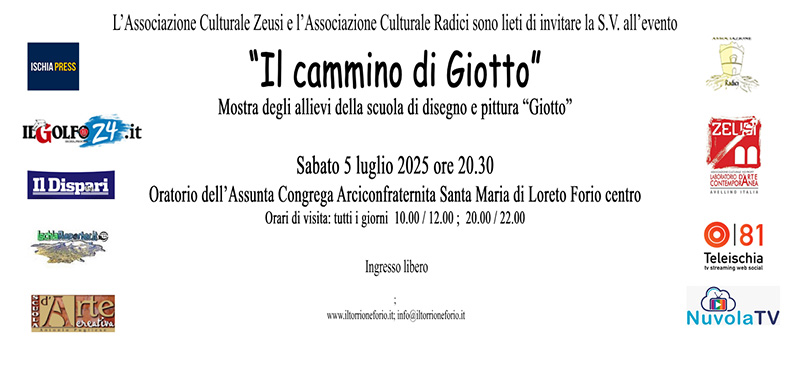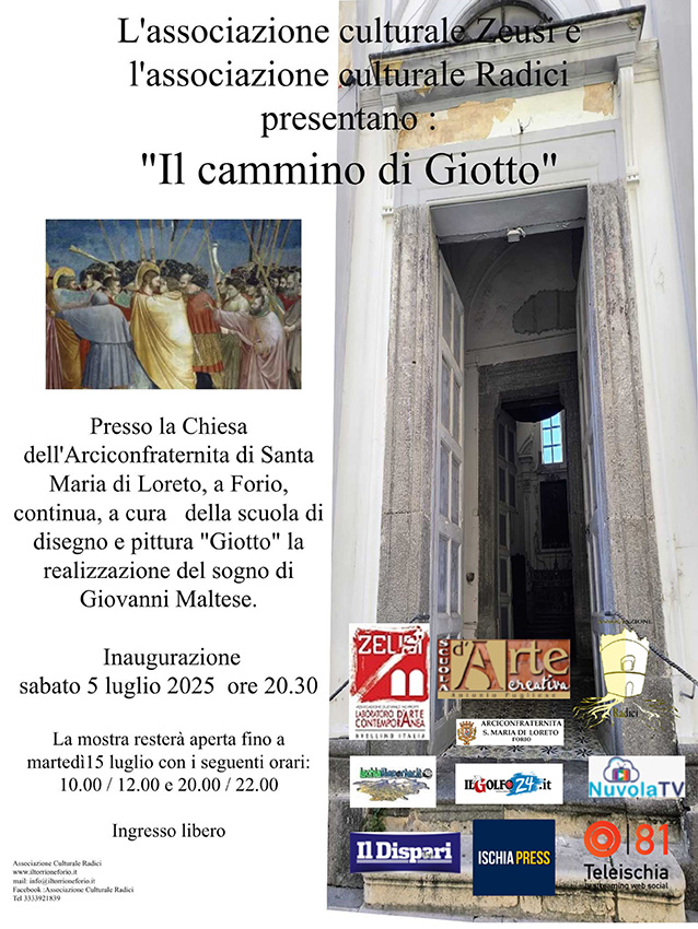 L’Associazione Culturale Zeusi e l’Associazione Culturale Radici, ringraziando quanti in vario modo hanno contribuito alla diffusione dei tantissimi eventi finora realizzati, e con l’auspicio che possa essere di gradimento dei tanti ospiti che onorano Ischia con la loro presenza, e a tutti gli isolani, ti attendono all’inaugurazione di sabato 5 luglio 2025 alle ore 20.30 presso l’oratorio dell’Assunta nella Basilica di Santa Maria di Loreto in corso Francesco Regine Forio centro.