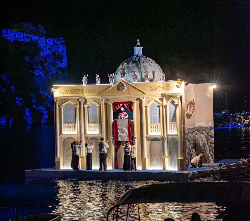 Un tributo intenso e spirituale a Papa Giovanni Paolo II, che ha saputo emozionare il pubblico con la forza del suo messaggio e la profondità della sua visione. L’allestimento ha raccontato il legame tra il Santo e l’isola, evocando i valori dell’ascolto, dell’accoglienza e dell’amore universale. Un’opera che ha unito fede, memoria e bellezza, trasformando la baia di Cartaromana in un luogo di riflessione e spiritualità.