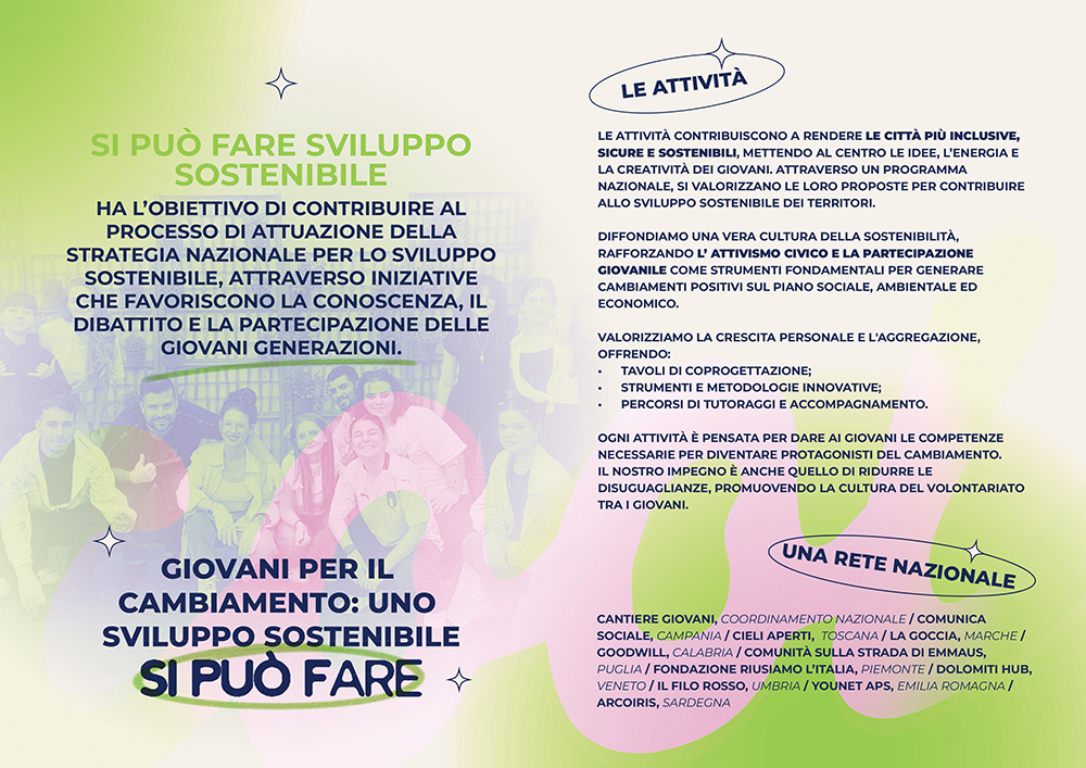 Si Può Fare – Sviluppo Sostenibile è un progetto co-finanziato dal Ministero dell’Ambiente e della Sicurezza Energetica, nell’ambito della Strategia Nazionale per lo Sviluppo Sostenibile. Un’iniziativa che mette al centro le idee, l’energia e la creatività delle nuove generazioni, valorizzando il loro ruolo attivo nello sviluppo dei territori.