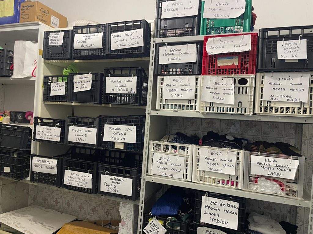Siamo partiti dalla sede parrocchiale sita in Via Sant’Antonio Abate nel reparto smistamento indumenti. Qui vengono selezionati indumenti idonei al riutilizzo che poi saranno donati ed etichettati per taglia e per tipologia (uomo, donna e bambino). Talvolta tra le donazioni anche abiti da sposa. Una delle studentesse ha chiesto se tutti possono chiedere aiuto, Maria Matarese ha tenuto a precisare che il loro dovere è quello di dare a prescindere dal credo o dalla etnia, il dovere dei volontari è quello di essere di supporto a chiunque lo richieda. Ci sono persone -racconta Maria – che sono accumulatori convulsivi che pur di accaparrarsi indumenti mentono spudoratamente, bisogna fare attenzione anche perché questo modo di fare può far perdere cose a persone che ne hanno davvero bisogno.