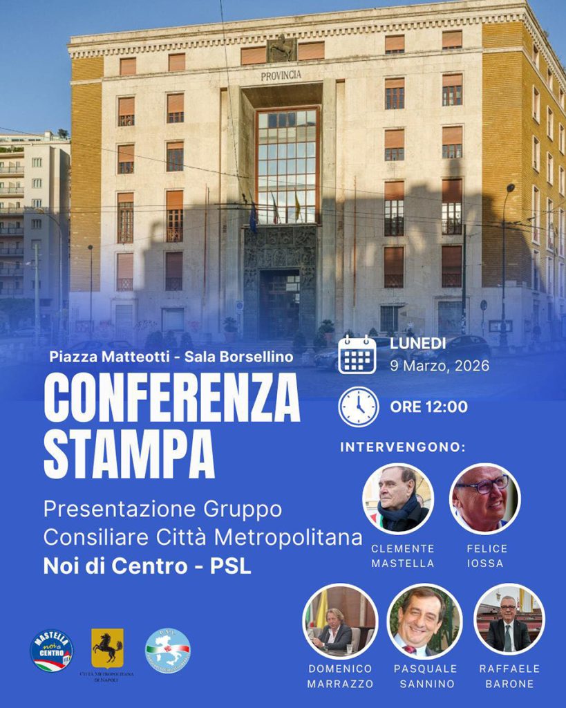Si svolgerà il prossimo lunedì 9 marzo, alle ore 12:00, nella Sala Borsellino al primo piano della sede della Città Metropolitana di Napoli in piazza Matteotti, la presentazione ufficiale del neo costituito Gruppo in Consiglio metropolitano “Noi di Centro – Popolari Socialisti Liberali”.
